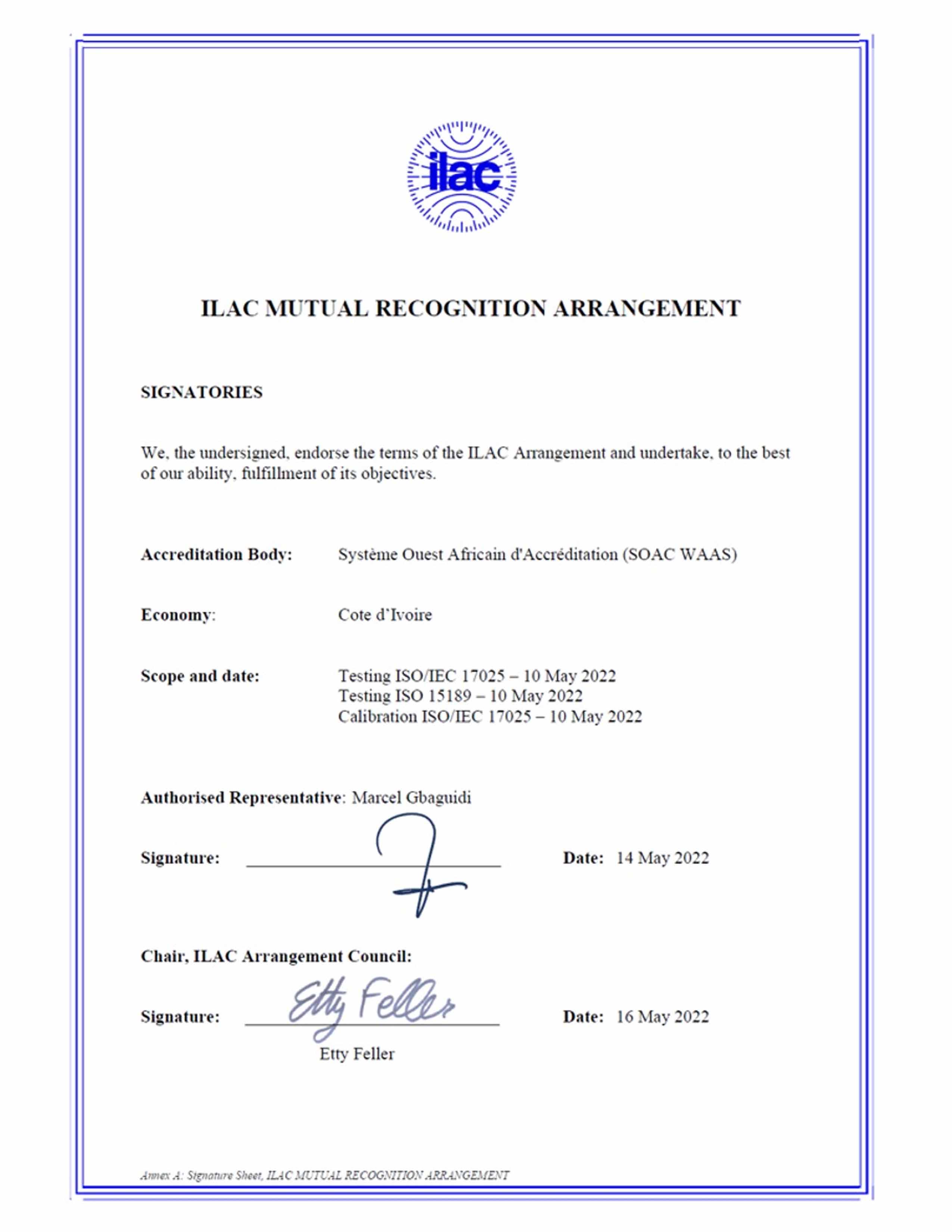 L’accréditation SOAC est une garantie pour la reconnaissance internationale des résultats d’évaluation de la conformité et facilite l’accès aux marchés des produits et services, au niveau national, régional et international. Cette reconnaissance internationale du SOAC est soutenue grâce aux accords multilatéraux de AFRAC, ILAC et IAF dont le SOAC est signataire.