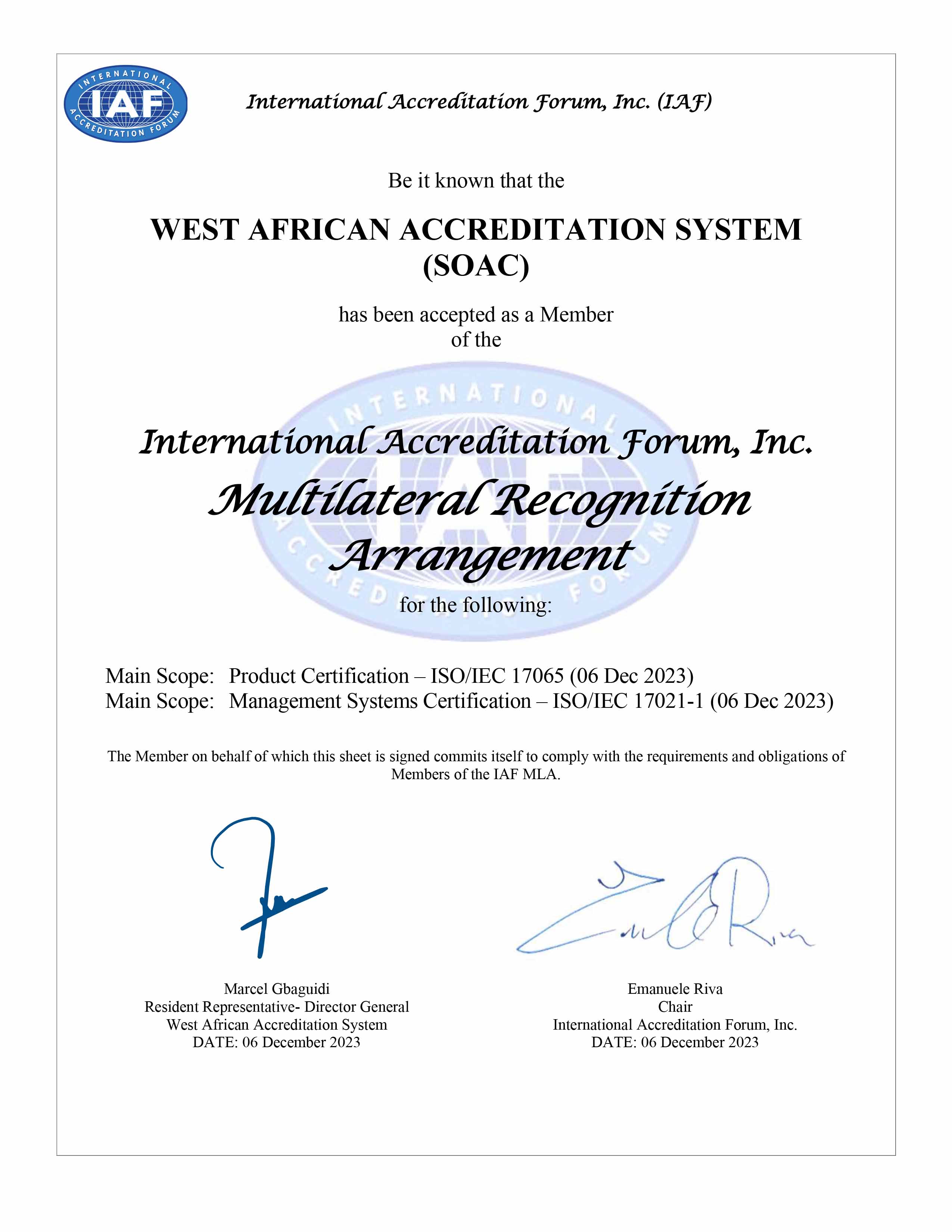 L’accréditation SOAC est une garantie pour la reconnaissance internationale des résultats d’évaluation de la conformité et facilite l’accès aux marchés des produits et services, au niveau national, régional et international. Cette reconnaissance internationale du SOAC est soutenue grâce aux accords multilatéraux de AFRAC, ILAC et IAF dont le SOAC est signataire.